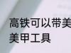 1、美甲工具是可以带上高铁的。2、美甲工具属于一般的工具,可以放在箱子里进行正常携带。但要遵守相关规定,规定是限量的,乘客只能随身携 ....