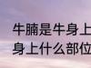 1、牛腩是牛腹部及靠近牛肋处的松软肌肉,带有筋、肉、油花的肉块。2、其次在里脊肉上层有一片筋少、油少、肉多,但形状不大规则的里脊边 ....